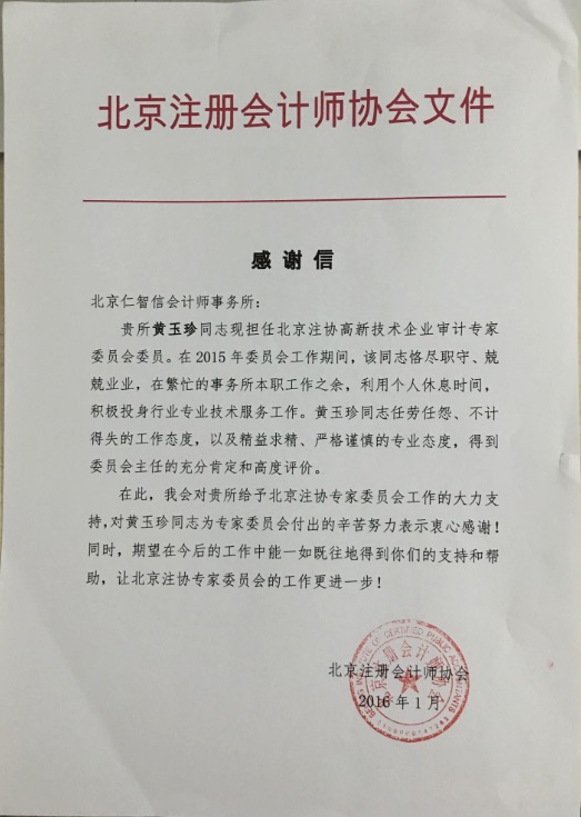 我所所长黄玉珍同志担任北京注协高新技术企业审计专家委员会委员。在2015年委员会工作期间,恪尽职守、兢兢业业。任劳任怨、不计得失的工作态度,以及精益求精、严格谨慎的专业态度,得到了委员会主任的充分肯定和高度评价。北注协特别发文感谢信,对于我所所长为专家委员会付出的辛苦努力表示衷心感谢!